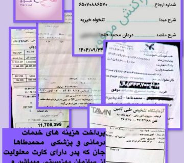 پرداخت هزینه های خدمات درمانی و پزشکی محمد طاها جان که پدر دارای کارت معلولیت از سازمان بهزیستی می باشد و با زندگی استیجاری در این شرایط اقتصادی گذران عمر می کنند اخبار, خبرهای فعالیت های موردی