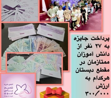 پرداخت جایزه به ۲۷ نفر از دانش آموزان ممتازمان در مقطع دبستان هرکدام به ارزش ٣٠٠/٠٠٠ تومان ۱۴۰۴/۸/۸ اخبار, خبرهای فعالیت های موردی