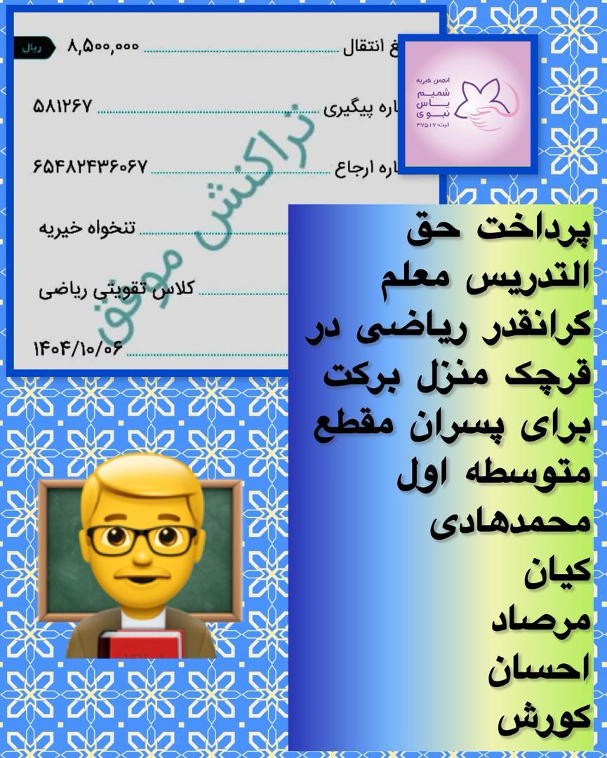 واریز بخشی از مبلغ پرداختی دانش آموز عزیزمان امیر محمد جان بعنوان مشارکت مردمی به مدرسه متاسفانه پدر امیر محمدجان درگیر بیماری سرطان مغز و استخوان هستند و هفته ای یکبار شیمی درمانی می شوند اخبار, خبرهای فعالیت های موردی
