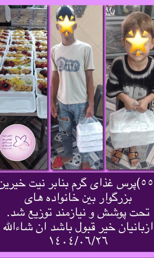 55 پرس غذای گرم بنابر نیت خیرین بزرگوار بین خانواده های تحت پوشش